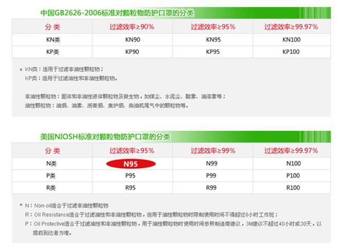 我們既然看到有N95,是不是還有其他型號(hào)呢?上面也整理到N95是較低的標(biāo)準(zhǔn),肯定還有較高的標(biāo)準(zhǔn)。NIOSH認(rèn)證的其他防顆粒物口罩級(jí)別還包括:N95、N99、N100、R95、R99、R100、P95、P99、P100,一共有9種。N,表示不耐油(not resistant to oil),適合非油性顆粒物;R,表示耐油(resistant to oil),適合油性或非油性顆粒物,若用于油性顆粒物的防護(hù),使用時(shí)間不超過(guò)8小時(shí)。P,表示防油(oil proof),適合油性或非油性顆粒物,若用于油性顆粒物,使用時(shí)間應(yīng)遵循制造商的建議。后面的數(shù)字則表示防護(hù)過(guò)濾能力。99表示過(guò)濾效率在99%以上,100表示過(guò)濾效率在99.7%以上。